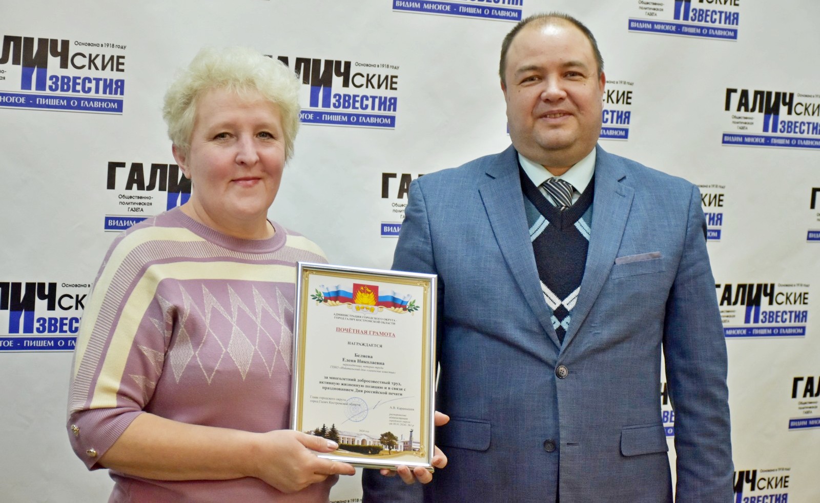 Поздравить коллектив редакции и типографии Издательского дома Галичские известия с наступающим профессиональным праздником - Днем российской печати и со 105-летием газеты "Галичские известия" пришли глава городского округа город Галич Алексей Карамышев и глава администрации Галичского муниципального района Александр Потехин. Они вручили почетные грамоты действующим работникам и уже ушедшим на заслуженный отдых - ветеранам труда, отдавшим многие годы своей жизни работе в средствах массовой информации. Десятилетия их трудом создавалась и распространялась газета для населения Галичского края и всех близлежащих районов. Весь непрерывный процесс шел изо дня в день и тысячи газет отпечатывались и вовремя доставлялись своим подписчикам. Спасибо Вам за этот нелегкий и каждодневный труд!